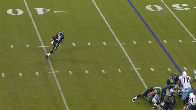 QB Russell Wilson of the Seahawks did a little magic against the Titans’ entire defense in Saturday’s preseason game. Wilson dropped back and did a “Now you see me, now you don’t” bootleg that landed the rookie a 32 yard TD run. The poor Titans D looked so confused.